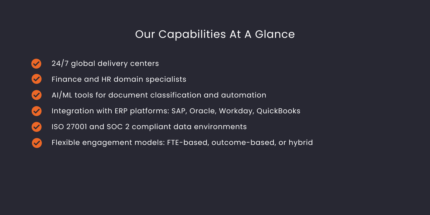 Our operations scale as your needs evolve, with real-time dashboards, SLAs, and audit trails ensuring consistent quality and performance visibility.