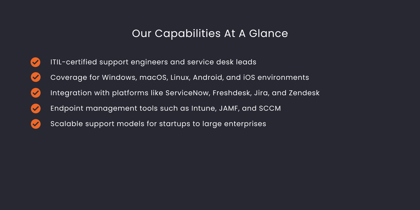 Our around-the-clock support ensures global operations remain uninterrupted, with multilingual agents and regional service desks where needed.